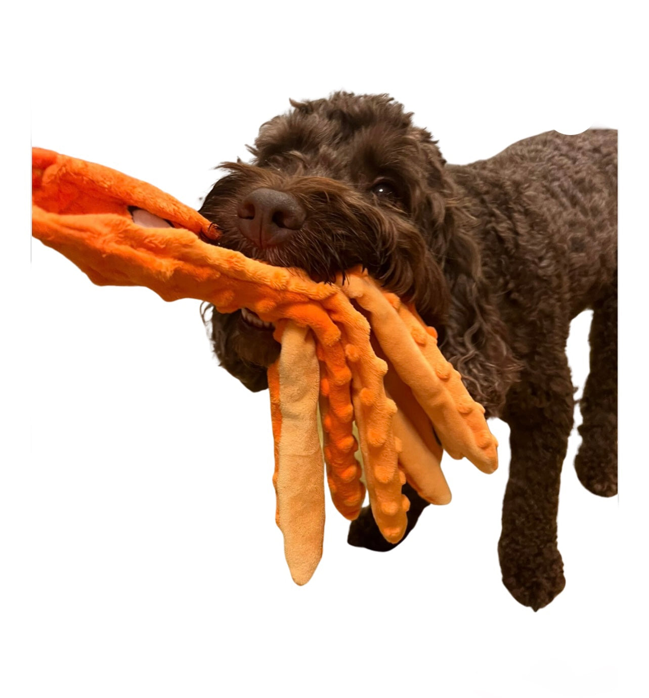 This is a fabulous toy that has proved to be popular upon testing. With a combination of a long soft handle, squeaky head and 8 crinkly legs!