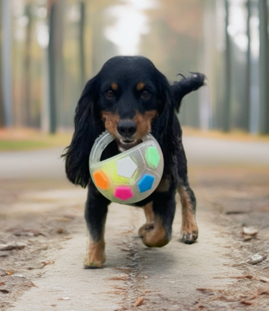 Made tough and bouncy, the outside is spongy so soft on your dogs mouths, there is a handle for your dog to carry the ball back to you, a squeaker inside and a tennis ball inside also.